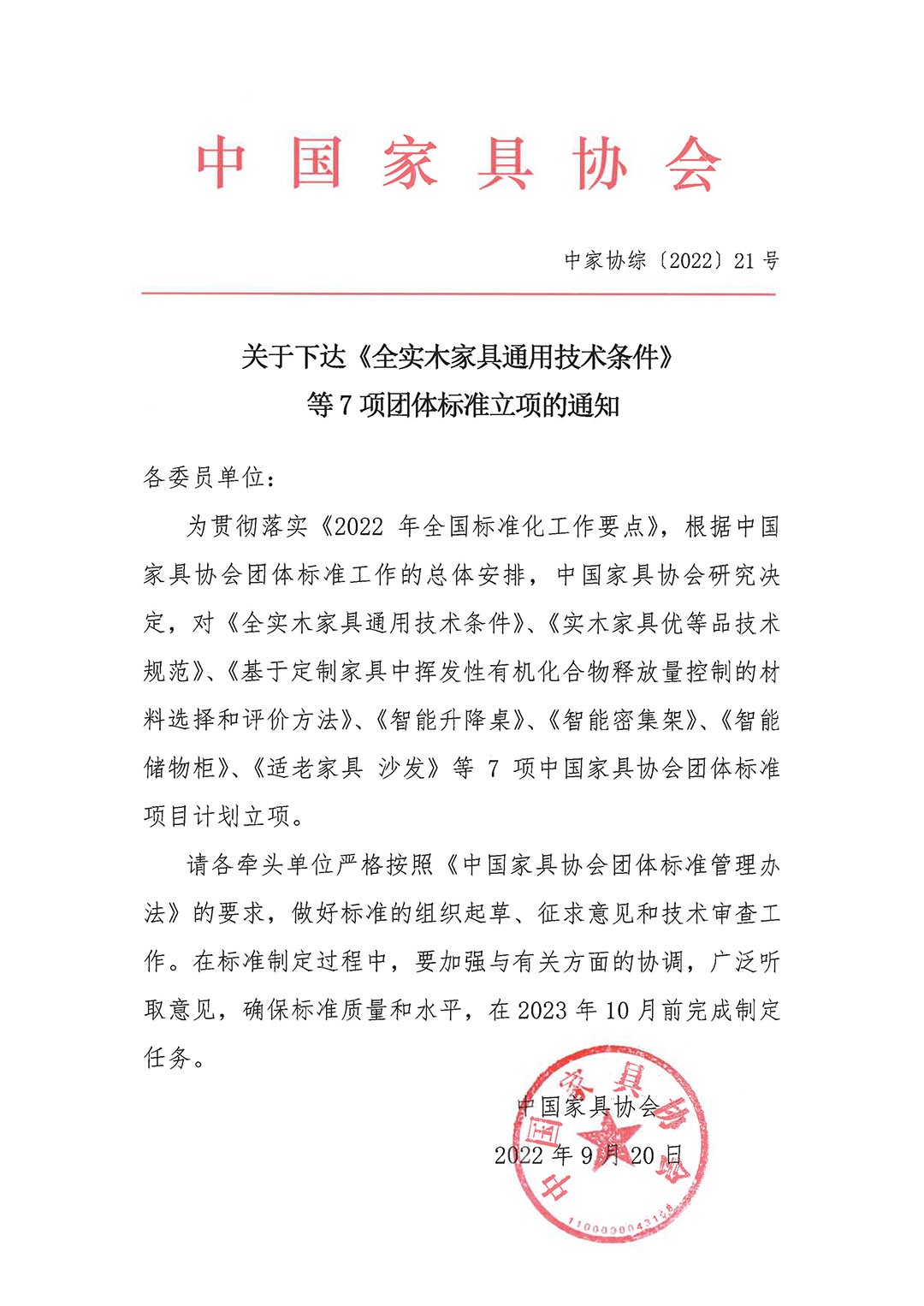 关于下达《全实木家具通用技术条件》等7项团体标准立项的通知