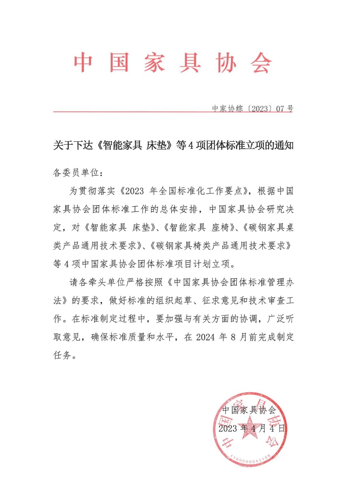 关于下达《智能家具 床垫》等4项团体标准立项的通知