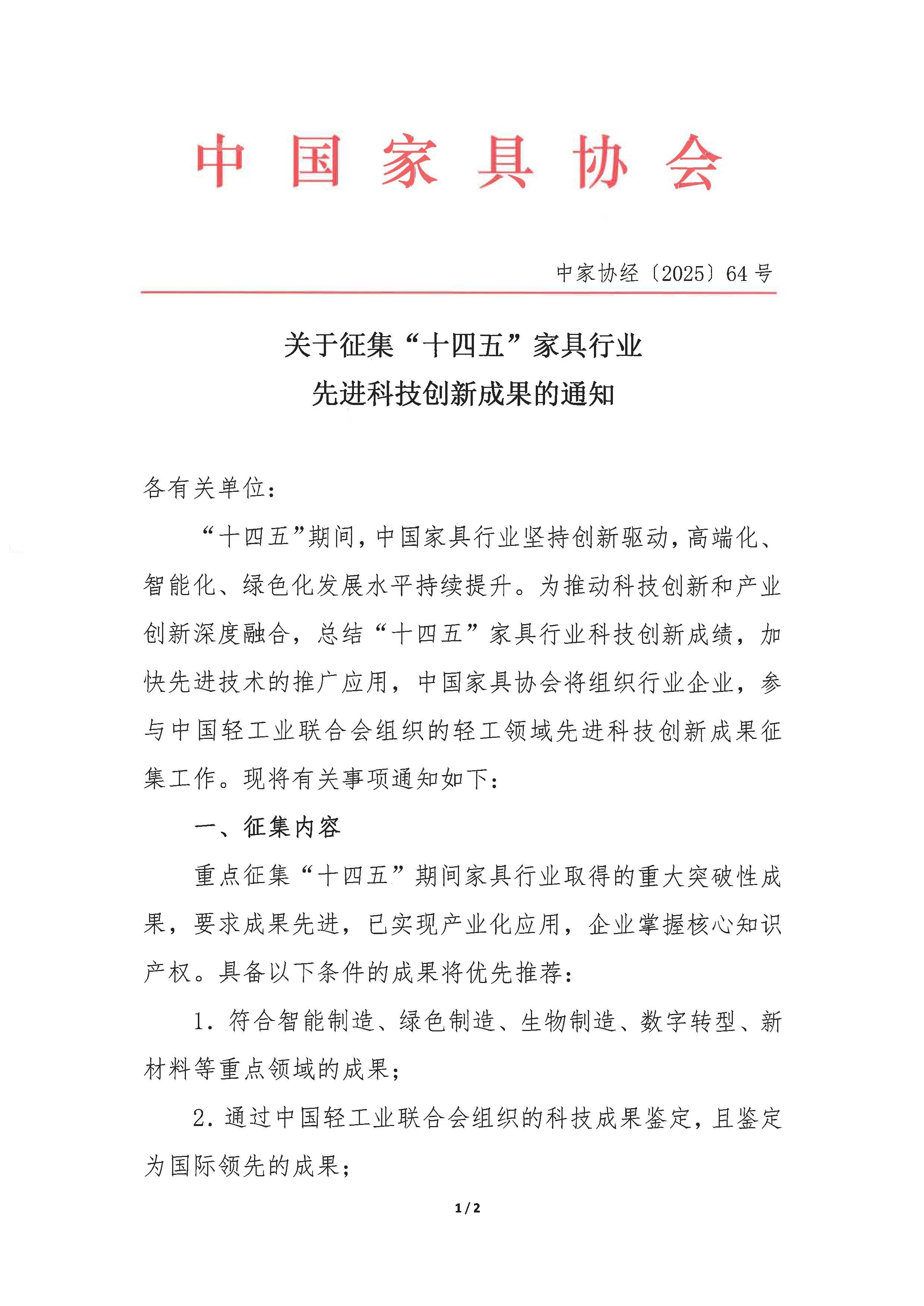关于征集“十四五”家具行业先进科技创新成果的通知