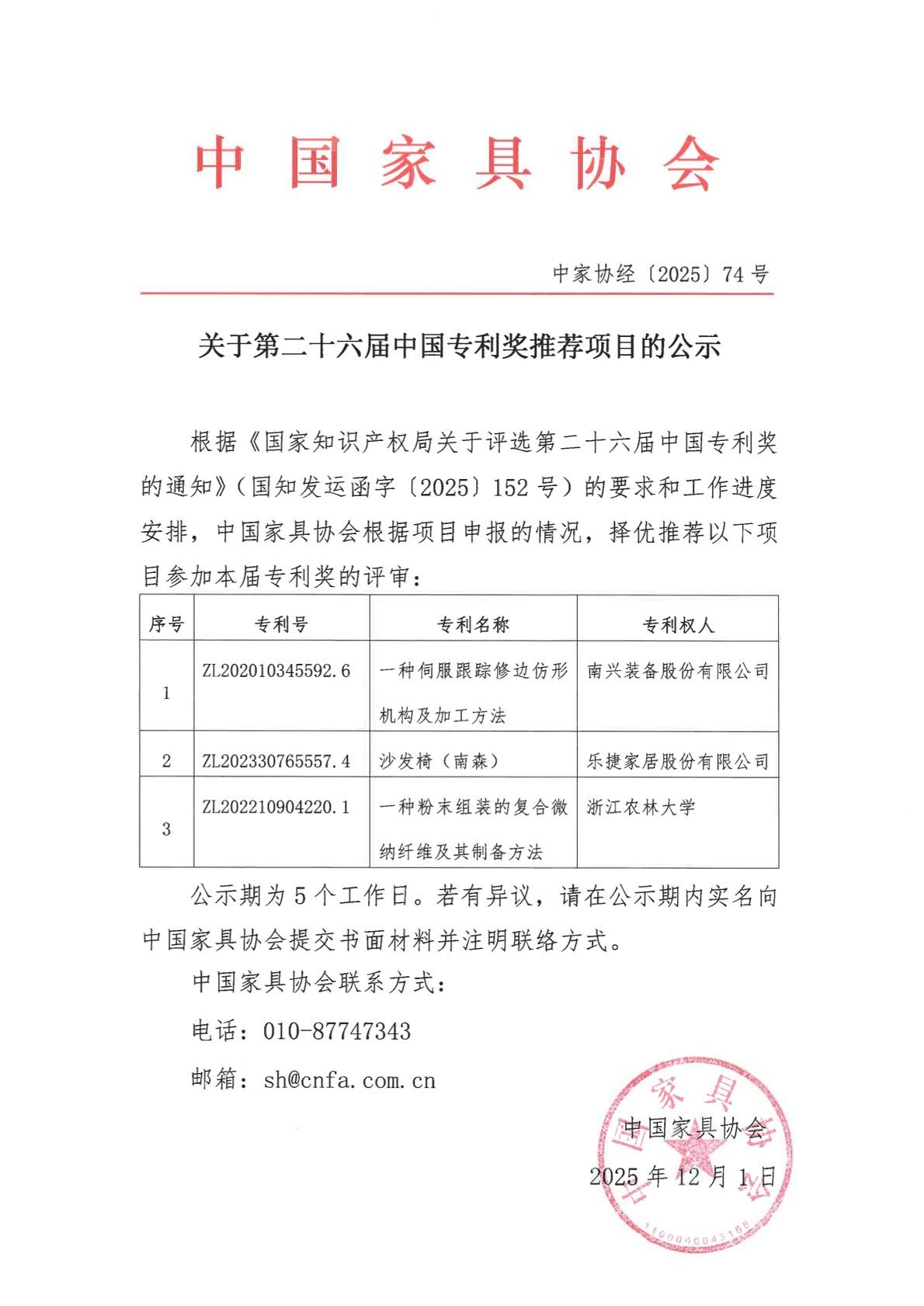 关于第二十六届中国专利奖推荐项目的公示