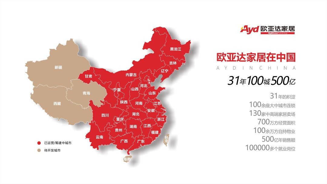 目前,欧亚达已在全国三、四线城市进行全面布局,加大新兴三四线城市的渠道下沉,进一步净化经营环境,提升服务创新,让更多消费者得以享受到精致城市的家居品质与服务,也让更多企业参与到城市创新中来,为民造福。