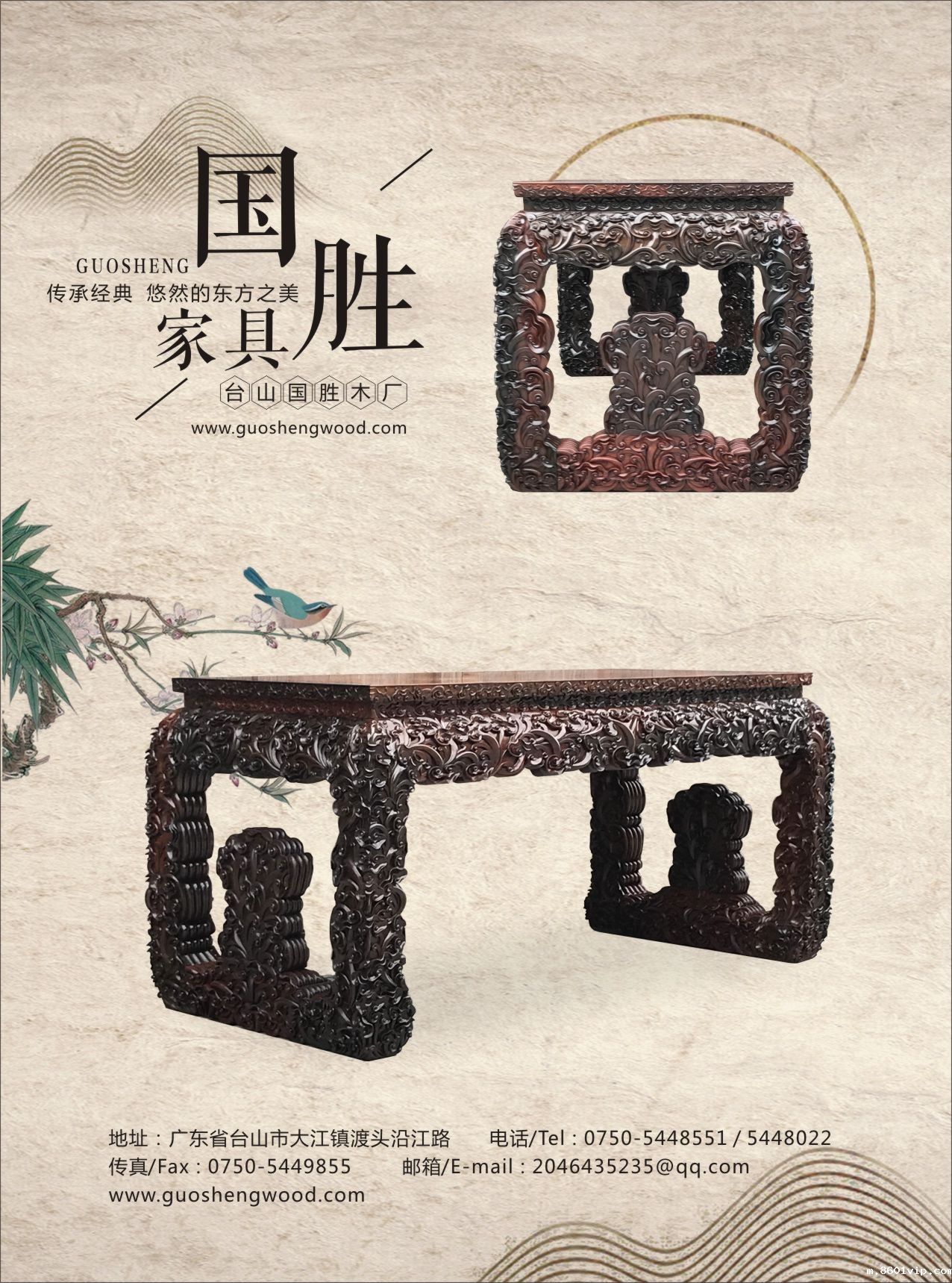 台山国胜木厂有限公司,位于中国传统家具专业镇——中国广东台山。本厂创建于1980年,主要选用上等的紫檀、黄花梨、酸枝等名贵木材制作明清仿古家具。经历四十载的锤炼,现拥有厂房二万多平方,人材优秀,实力雄厚,是红木制作知名厂家。