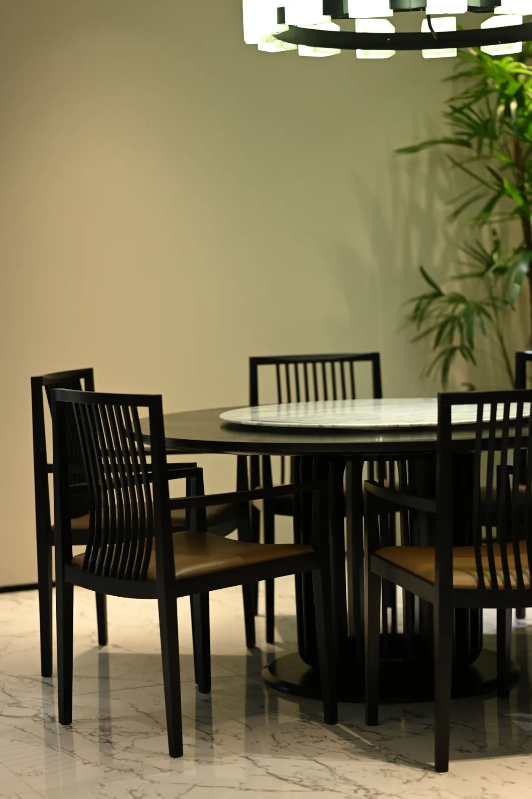 The dining table derives its idea from Chinese ancient lanterns. 24 curved solid-wood pieces are used to form the base which represents 24 solar terms. The all-year-round time circle implies satisfactory and happy life status. The edge of the table is polished delicately for user safety. Besides, based on an in-depth study on ergonomics, the base stretches inward to guarantee both stability and comfortable experience. Tow kinds of materials are combined for the surface -- walnut at the lower layer and marble at the upper layer. Their combination creates gentleness and elegance. The marble top is also rotational, suitable for flexible dining.