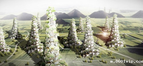“山居”的外形为白色蜂窝结构的高大圆锥体,毫无装饰,仅仅凭借它们天生的轮廓和体形铸就含蓄稳健的美感,如山岳一般矗立大地。这一设计中,既包含了对中 国隐居文化中的山林意境的追寻,以未来主义和现实主义手法解读传统,也表达人类在城市持续扩张需求和保护耕地之间建立新的平衡,使人居和地球表面重归和谐 的期望,让久居都市的人群能重获“采菊东篱下,悠然见南山”式的自然写意生活。