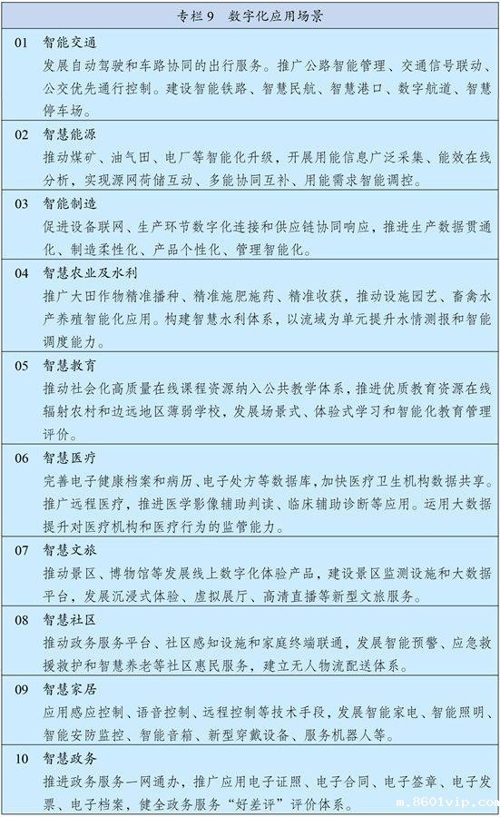 实施“上云用数赋智”行动,推动数据赋能全产业链协同转型。在重点行业和区域建设若干国际水准的工业互联网平台和数字化转型促进中心,深化研发设计、生产制造、经营管理、市场服务等环节的数字化应用,培育发展个性定制、柔性制造等新模式,加快产业园区数字化改造。深入推进服务业数字化转型,培育众包设计、智慧物流、新零售等新增长点。加快发展智慧农业,推进农业生产经营和管理服务数字化改造。