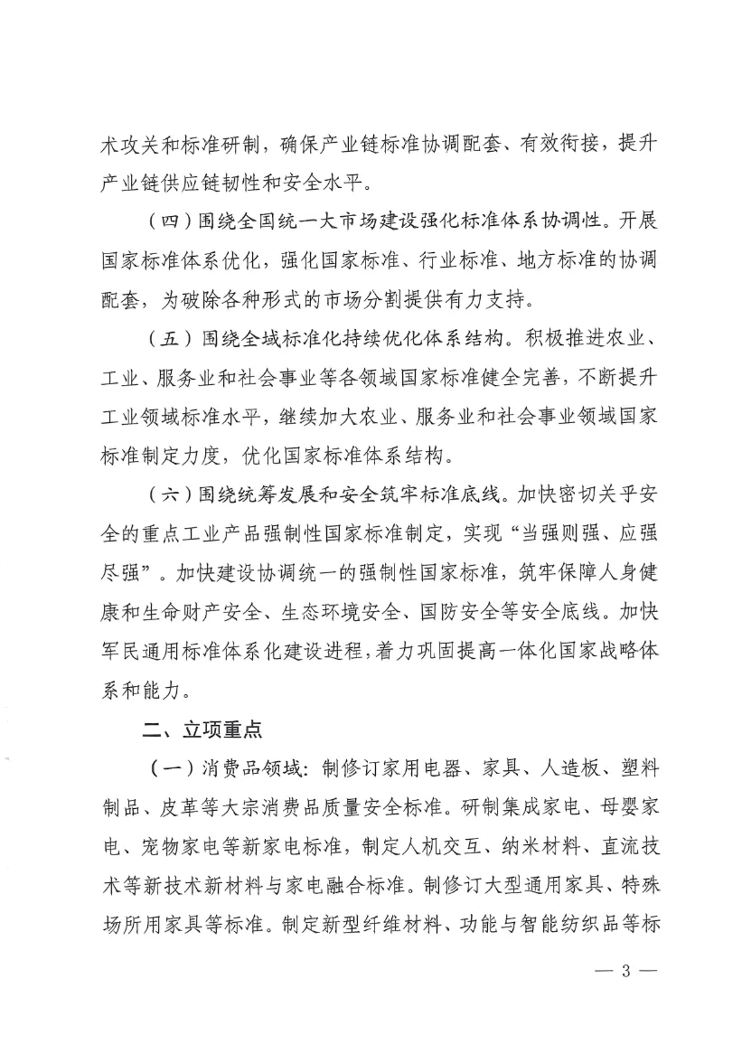 1月12日,国家市场监督管理总局(国家标准化管理委员会)发布关于印发《2024年国家标准立项指南》的通知,其中消费品领域立项重点包括:制修订家用电器、家具、人造板、塑料制品、皮革等大宗消费品质量安全标准;研制集成家电、母婴家电、宠物家电等新家电标准,制定人机交互、纳米材料、直流技术等新技术新材料与家电融合标准;制修订大型通用家具、特殊场所用家具等标准;制定新型纤维材料、功能与智能纺织品等标准;制定婴童和老年等特殊人群、典型场景、用户体验等消费品标准;制定高端医疗装备、新兴医疗设备等医疗器械标准,通知如下。