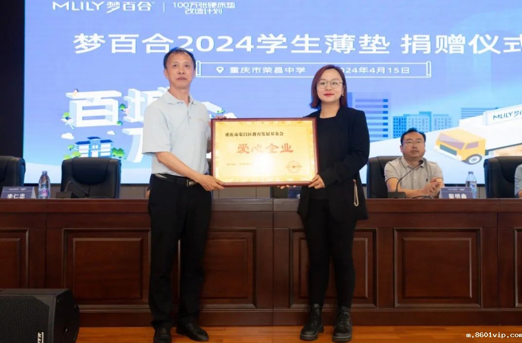4月15日下午,MLILY梦百合爱心捐赠车辆驶入荣昌中学,出席仪式的领导、嘉宾现场将捐赠产品发放到100名学子手上,重庆市荣昌区教育发展基金会向梦百合家居科技股份有限公司颁发爱心企业牌匾,对MLILY梦百合此次捐赠表达了衷心的感谢。