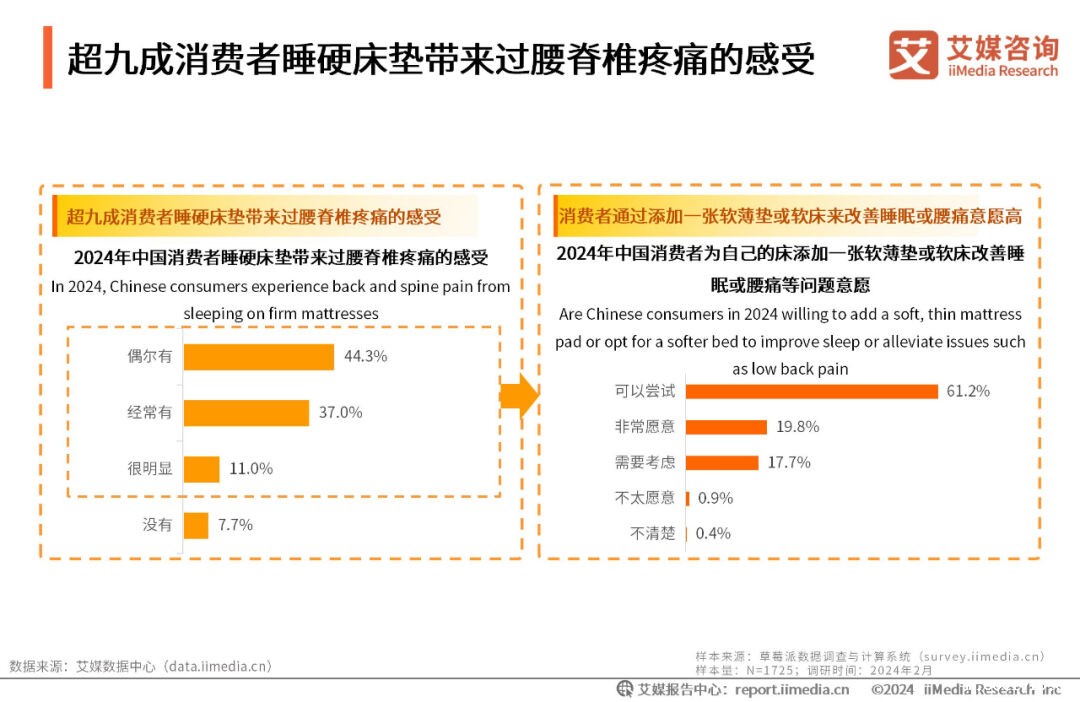 艾媒咨询发布的《2024年中国硬床垫使用现状及潜在危害调研》报告显示,92.3%消费者反映睡硬床垫带来过腰脊椎疼痛的感受,不少骨科医生也普及过睡硬床的危害:硬床的贴合度差,当人体躺在硬床上的时候,颈椎、腰椎会悬空、失去支撑,直接造成睡感不舒服、睡眠质量差,久而久之会引起脊柱健康问题。