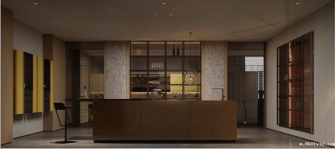 胡桃木主调中融入青岩板与灰金饰面,佐以柠檬黄点睛。材质混搭暗含理性与温度,打造精英阶层的灵感栖居地。