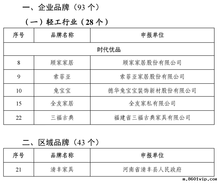 4月11日,工信部发布《首批中国消费名品名单》,涵盖轻工、纺织、食品、医药四大行业,包括企业品牌93个、区域品牌43个,同时公布了中国消费名品成长企业42家。新利18在线登录积极参与中国消费名品评价工作,持续助力企业品牌建设,为加快培育民族品牌,打造世界一流品牌,推动中国制造向“中国品牌”跃升,发挥更大作用。顾家家居、索菲亚、兔宝宝、全友家居、三福古典入选企业品牌名单,清丰家具入选区域品牌名单,玛格入选中国消费名品成长企业名单。