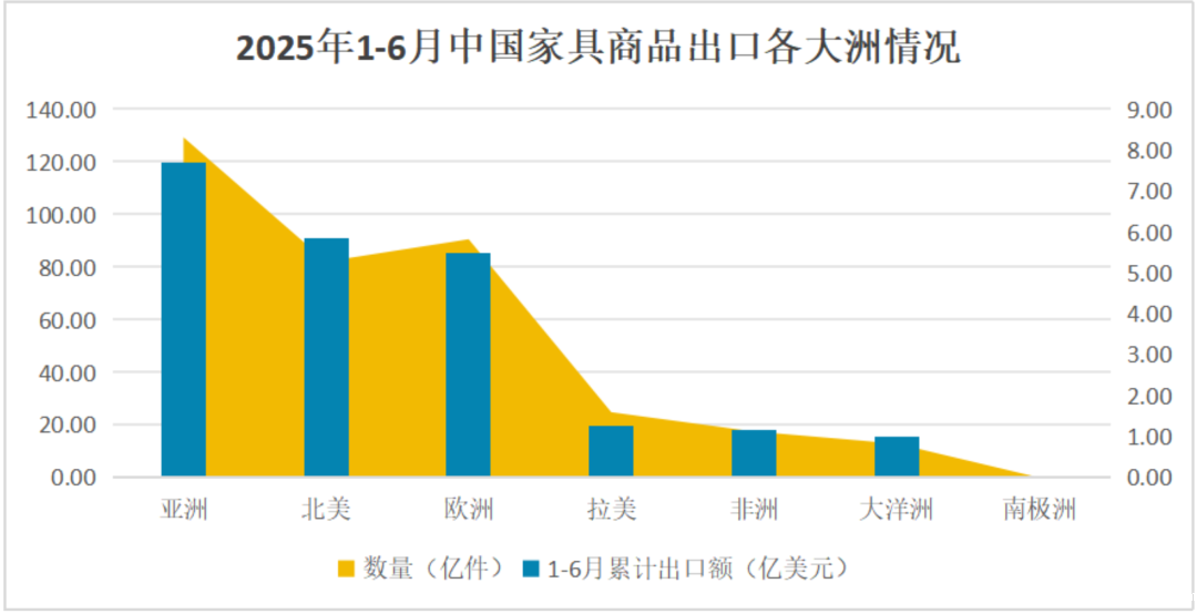 2025年1-6月,中国家具商品出口集中在亚洲、北美洲、欧洲市场,约占全部出口的84.75%。其中,出口亚洲市场119.73亿美元,占全部出口额(下同)的34.29%;出口北美市场90.80亿美元,占26.01%;出口欧洲市场85.38亿美元,占24.45%;出口拉美市场19.43亿美元,占5.57%;出口非洲18.32亿美元,占5.25%;出口大洋洲市场15.48亿美元,占4.43%。